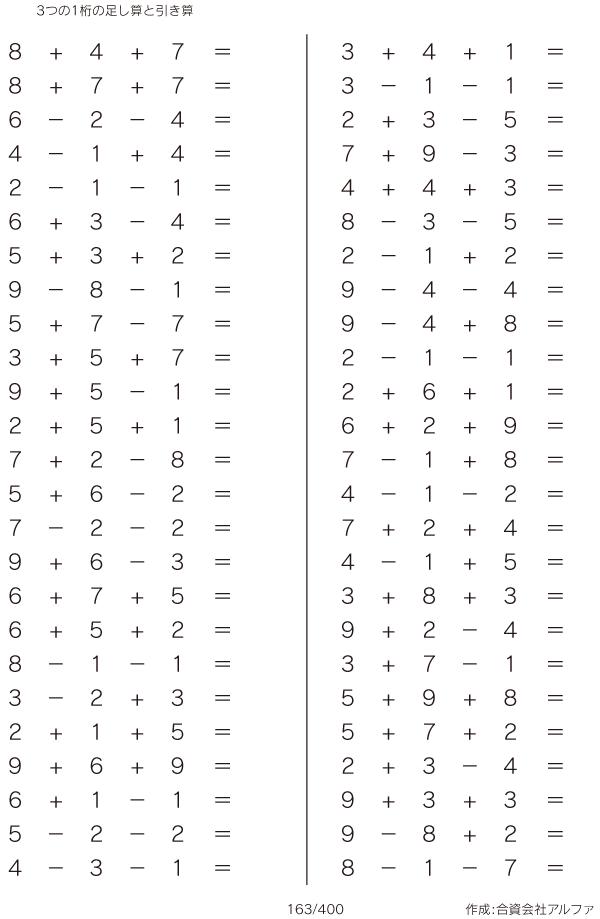 上記のボタンから「3つの1桁の足し算と引き算」の算数数学ドリル・計算ドリル(PDFプリント)がダウンロードできます。個人利用は無料です(家庭以外での配布は有料です)。
