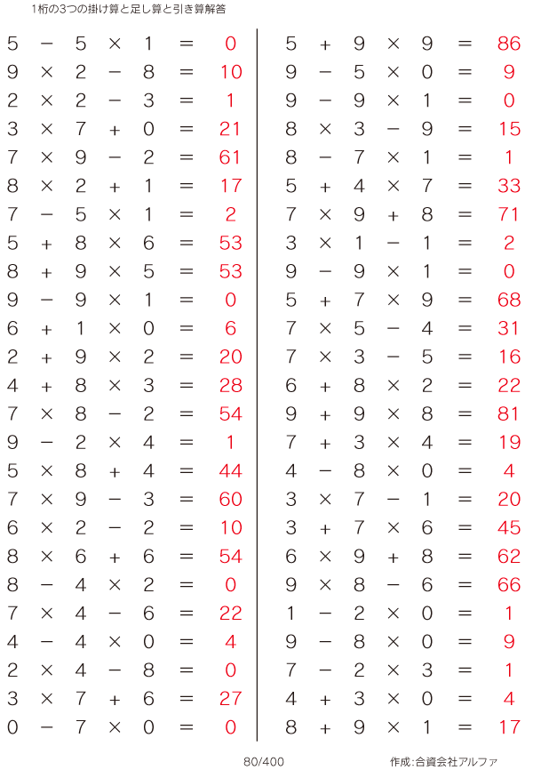 1桁の3つの掛け算と足し算と引き算 [解答]080/400