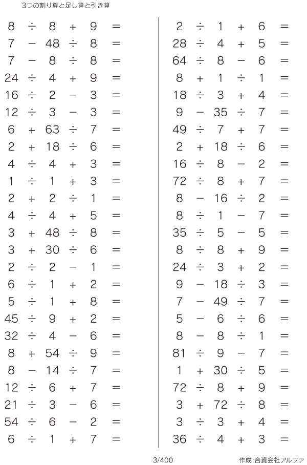 上記のボタンから「3つの割り算と足し算と引き算」の算数数学ドリル・計算ドリル(PDFプリント)がダウンロードできます。個人利用は無料です(家庭以外での配布は有料です)。