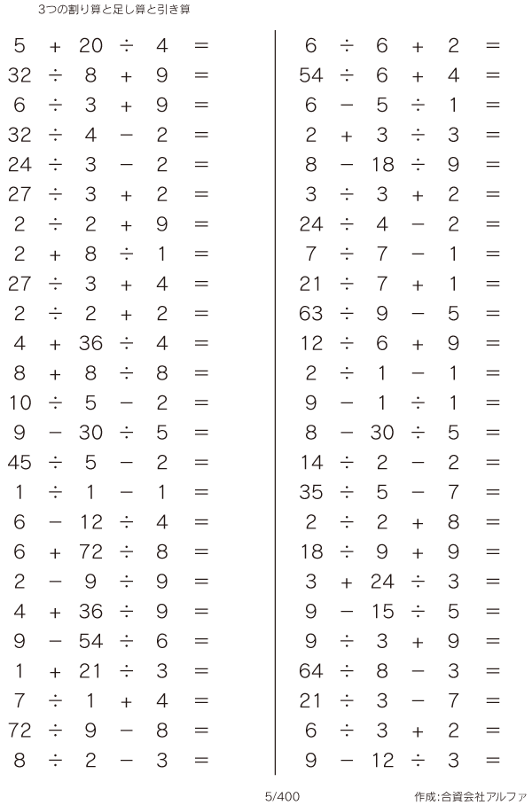 上記のボタンから「3つの割り算と足し算と引き算」の算数数学ドリル・計算ドリル(PDFプリント)がダウンロードできます。個人利用は無料です(家庭以外での配布は有料です)。