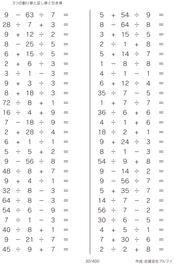 上記のボタンから「3つの割り算と足し算と引き算」の算数数学ドリル・計算ドリル(PDFプリント)がダウンロードできます。個人利用は無料です(家庭以外での配布は有料です)。