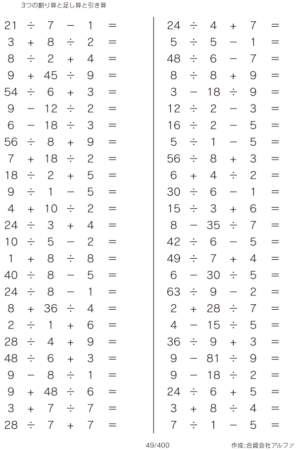 上記のボタンから「3つの割り算と足し算と引き算」の算数数学ドリル・計算ドリル(PDFプリント)がダウンロードできます。個人利用は無料です(家庭以外での配布は有料です)。