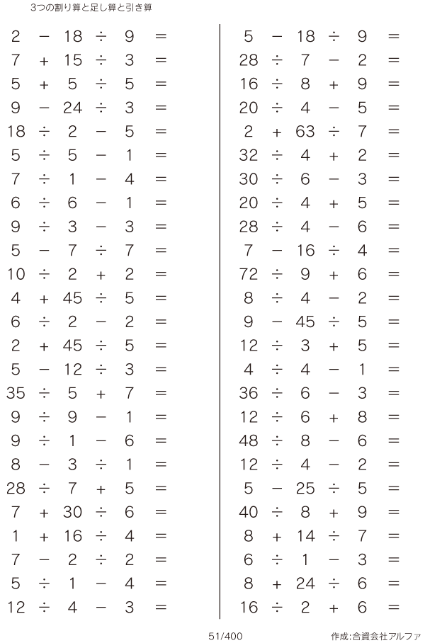 上記のボタンから「3つの割り算と足し算と引き算」の算数数学ドリル・計算ドリル(PDFプリント)がダウンロードできます。個人利用は無料です(家庭以外での配布は有料です)。