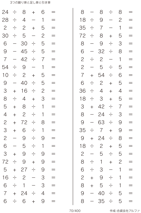 上記のボタンから「3つの割り算と足し算と引き算」の算数数学ドリル・計算ドリル(PDFプリント)がダウンロードできます。個人利用は無料です(家庭以外での配布は有料です)。