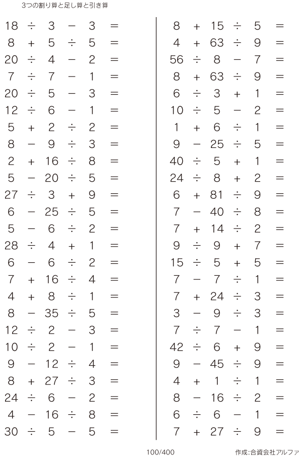 上記のボタンから「3つの割り算と足し算と引き算」の算数数学ドリル・計算ドリル(PDFプリント)がダウンロードできます。個人利用は無料です(家庭以外での配布は有料です)。