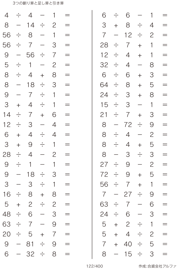 上記のボタンから「3つの割り算と足し算と引き算」の算数数学ドリル・計算ドリル(PDFプリント)がダウンロードできます。個人利用は無料です(家庭以外での配布は有料です)。