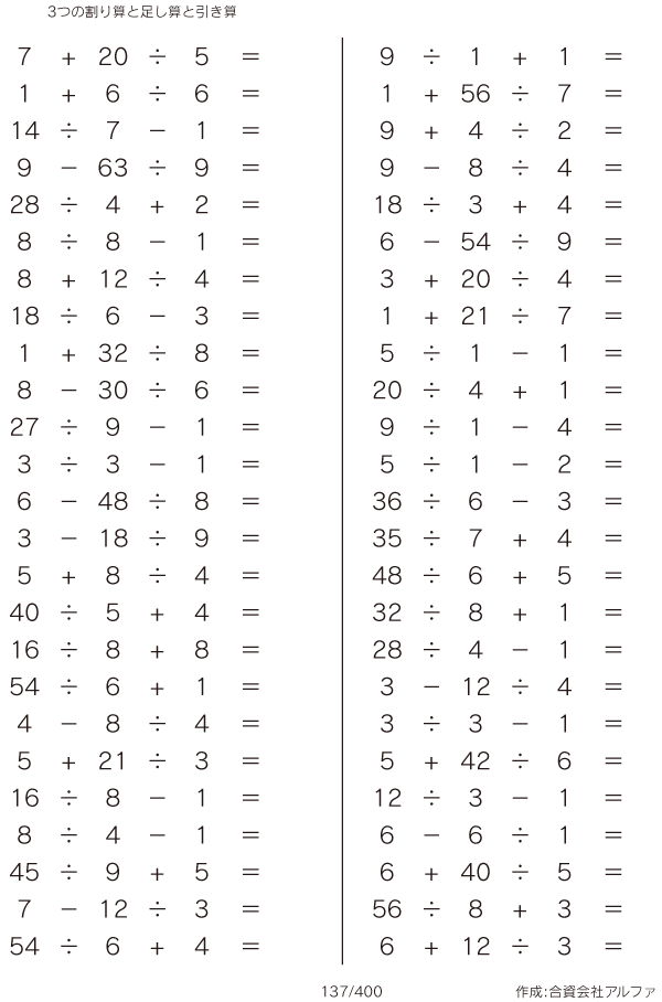 上記のボタンから「3つの割り算と足し算と引き算」の算数数学ドリル・計算ドリル(PDFプリント)がダウンロードできます。個人利用は無料です(家庭以外での配布は有料です)。