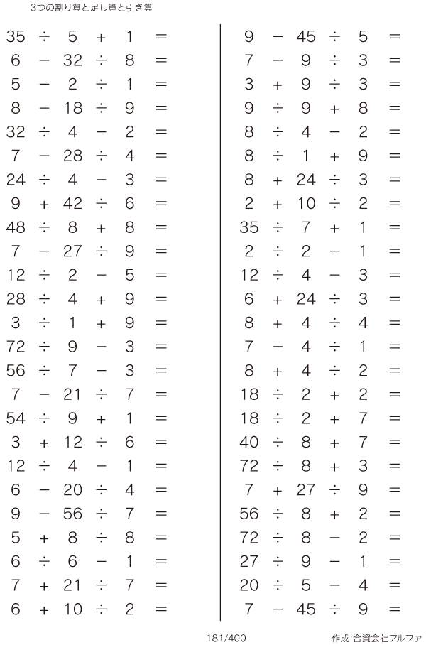 上記のボタンから「3つの割り算と足し算と引き算」の算数数学ドリル・計算ドリル(PDFプリント)がダウンロードできます。個人利用は無料です(家庭以外での配布は有料です)。