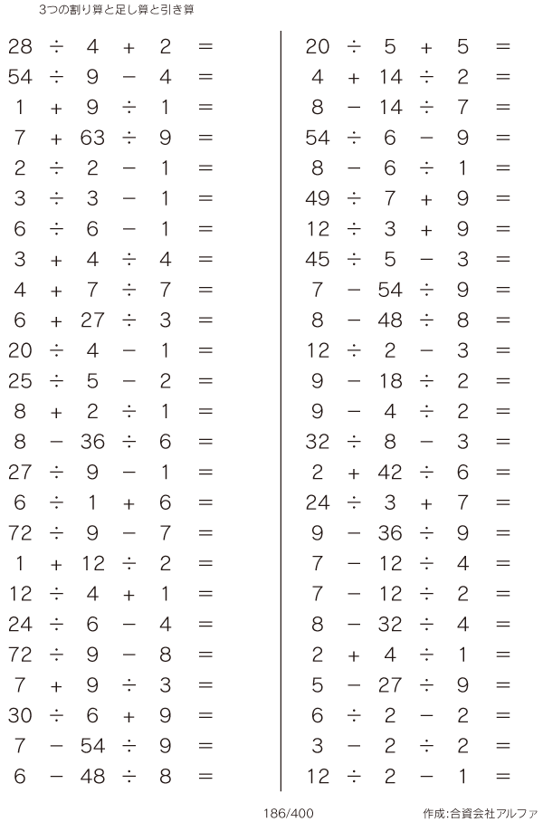 上記のボタンから「3つの割り算と足し算と引き算」の算数数学ドリル・計算ドリル(PDFプリント)がダウンロードできます。個人利用は無料です(家庭以外での配布は有料です)。