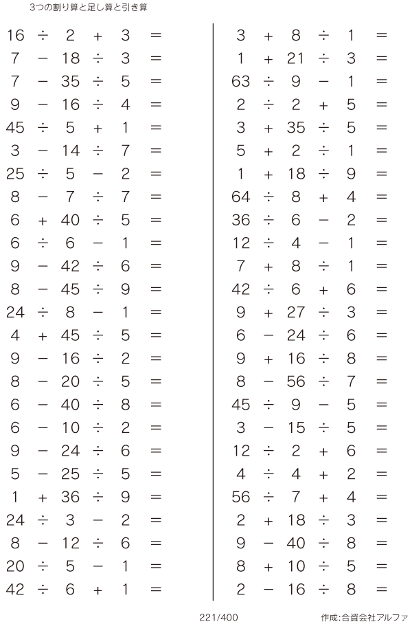 上記のボタンから「3つの割り算と足し算と引き算」の算数数学ドリル・計算ドリル(PDFプリント)がダウンロードできます。個人利用は無料です(家庭以外での配布は有料です)。
