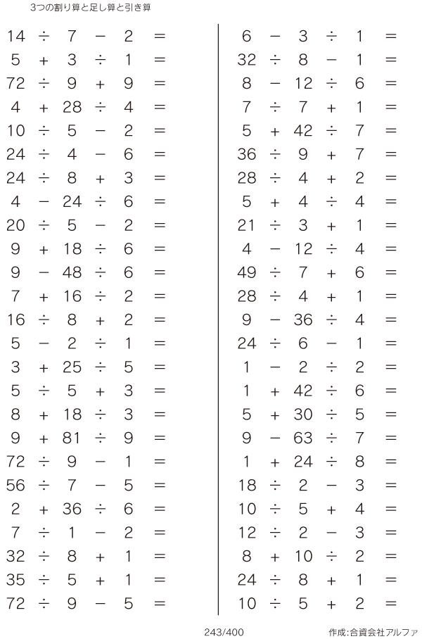 上記のボタンから「3つの割り算と足し算と引き算」の算数数学ドリル・計算ドリル(PDFプリント)がダウンロードできます。個人利用は無料です(家庭以外での配布は有料です)。
