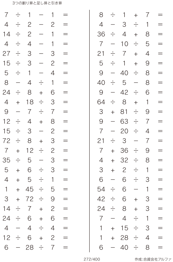 上記のボタンから「3つの割り算と足し算と引き算」の算数数学ドリル・計算ドリル(PDFプリント)がダウンロードできます。個人利用は無料です(家庭以外での配布は有料です)。
