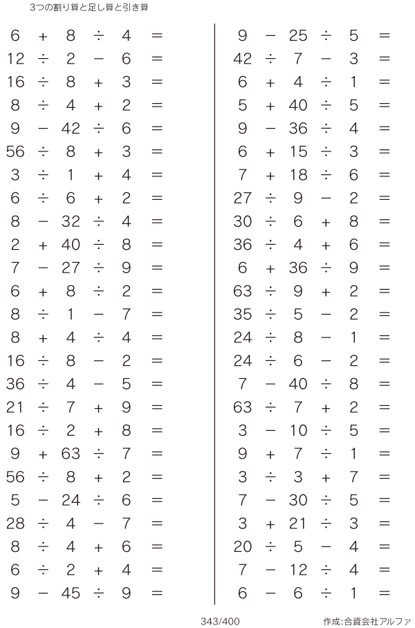 上記のボタンから「3つの割り算と足し算と引き算」の算数数学ドリル・計算ドリル(PDFプリント)がダウンロードできます。個人利用は無料です(家庭以外での配布は有料です)。