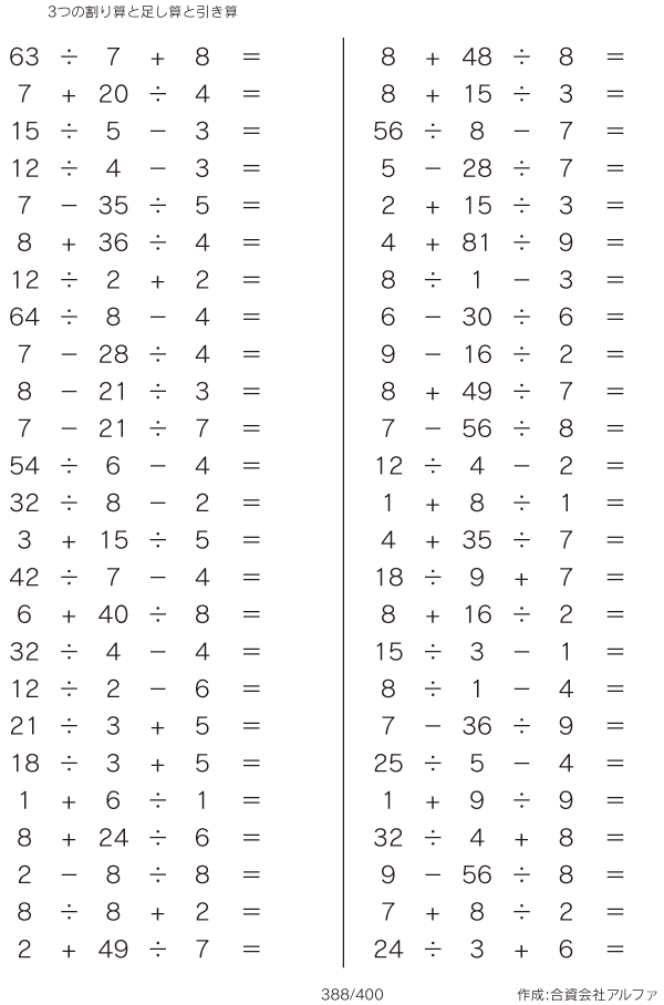 上記のボタンから「3つの割り算と足し算と引き算」の算数数学ドリル・計算ドリル(PDFプリント)がダウンロードできます。個人利用は無料です(家庭以外での配布は有料です)。