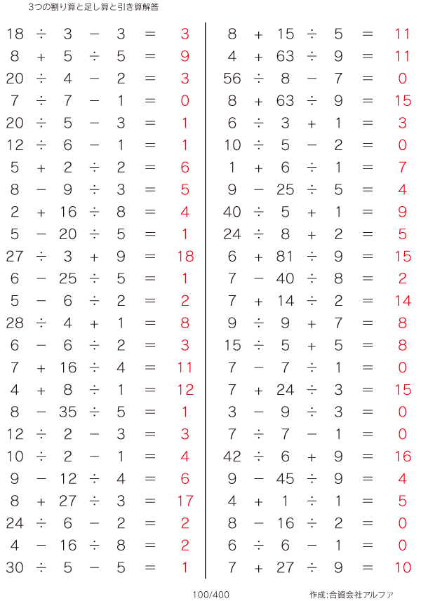 3つの割り算と足し算と引き算 [解答]100/400