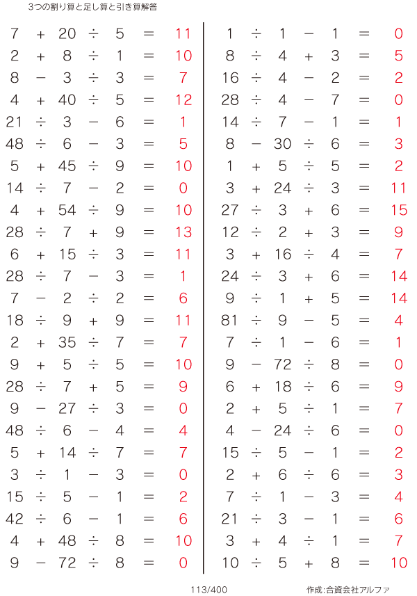 上記のボタンから「3つの割り算と足し算と引き算」の算数数学ドリル・計算ドリル(PDFプリント)がダウンロードできます。個人利用は無料です(家庭以外での配布は有料です)。