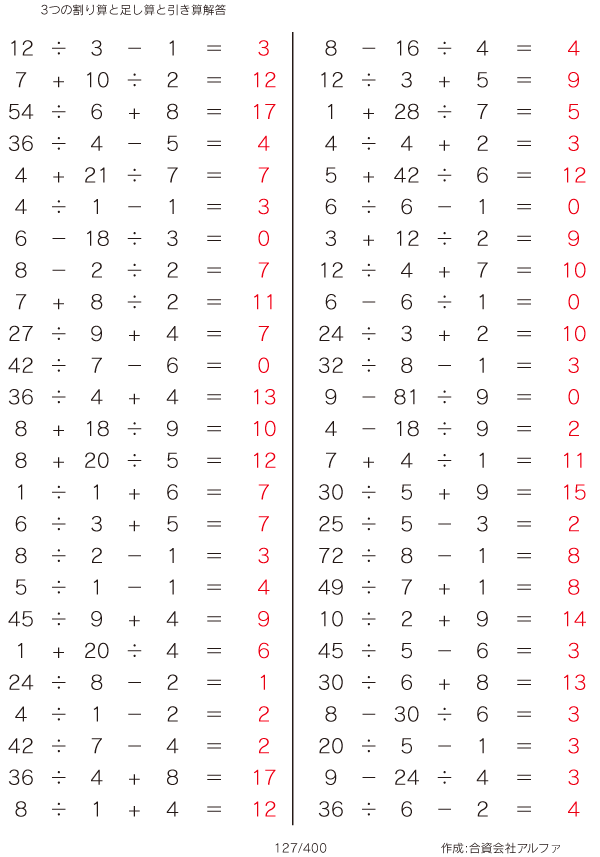 上記のボタンから「3つの割り算と足し算と引き算」の算数数学ドリル・計算ドリル(PDFプリント)がダウンロードできます。個人利用は無料です(家庭以外での配布は有料です)。