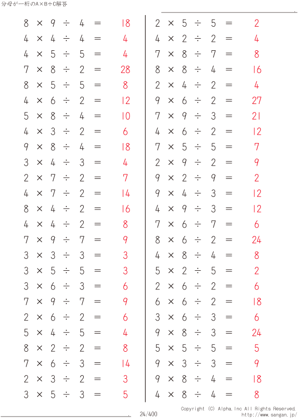 上記のボタンから「分母が一桁のA×B÷C」の算数数学ドリル・計算ドリル(PDFプリント)がダウンロードできます。個人利用は無料です(家庭以外での配布は有料です)。