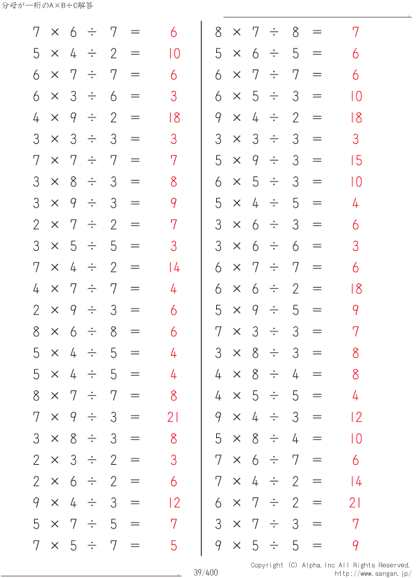 上記のボタンから「分母が一桁のA×B÷C」の算数数学ドリル・計算ドリル(PDFプリント)がダウンロードできます。個人利用は無料です(家庭以外での配布は有料です)。