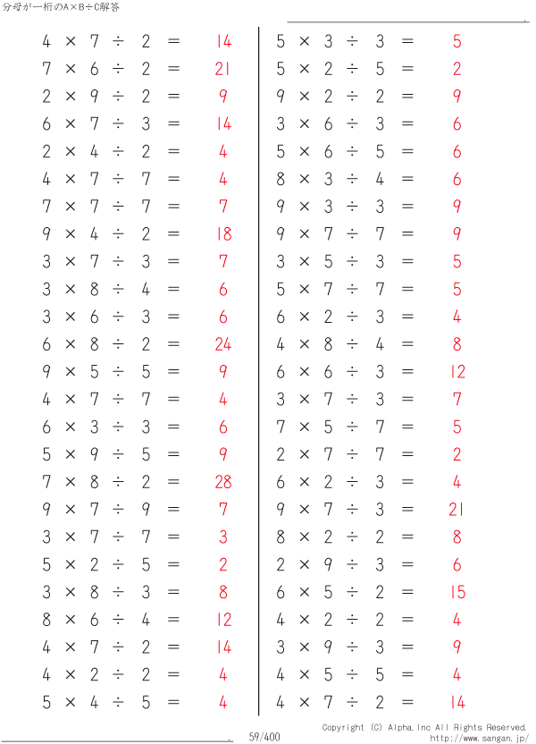 上記のボタンから「分母が一桁のA×B÷C」の算数数学ドリル・計算ドリル(PDFプリント)がダウンロードできます。個人利用は無料です(家庭以外での配布は有料です)。