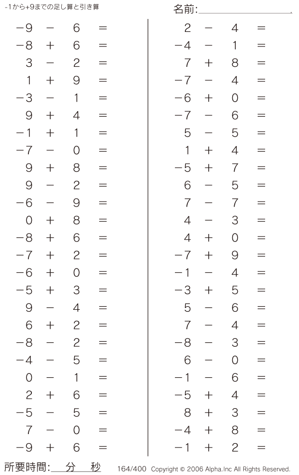 上記のボタンから「-1から+9までの足し算と引き算」の算数数学ドリル・計算ドリル(PDFプリント)がダウンロードできます。個人利用は無料です(家庭以外での配布は有料です)。