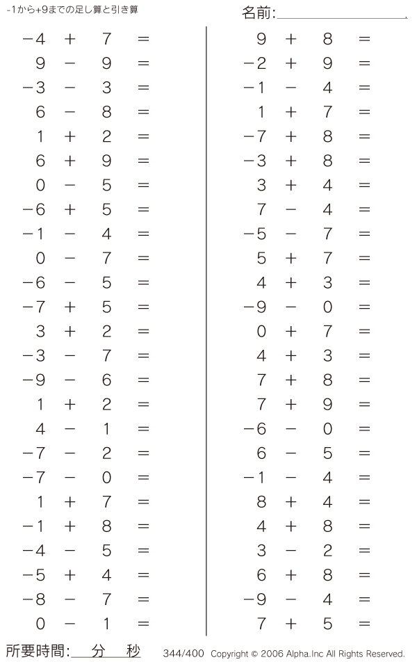 -1から+9までの足し算と引き算 [問題]344/400