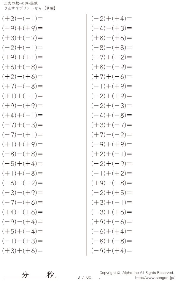 正負の数-加減-整数 [問題]031/100
