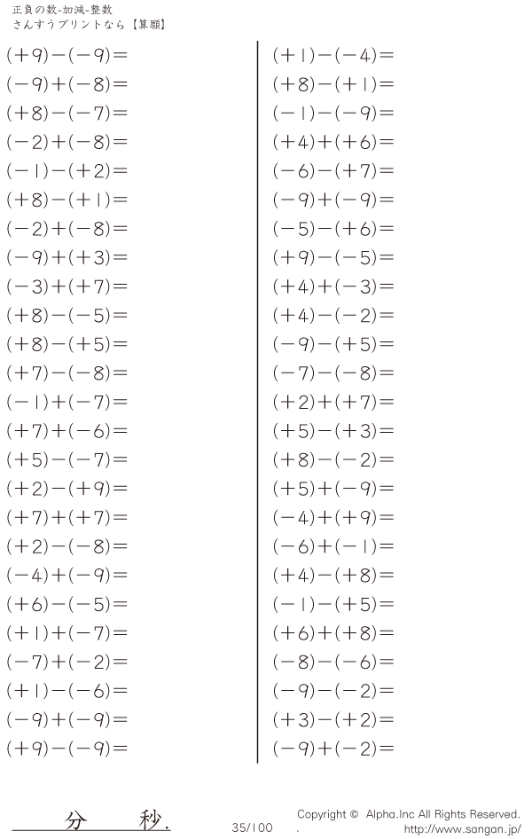 正負の数-加減-整数 [問題]035/100