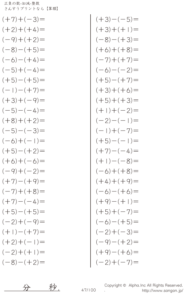 上記のボタンから「正負の数-加減-整数」の算数数学ドリル・計算ドリル(PDFプリント)がダウンロードできます。個人利用は無料です(家庭以外での配布は有料です)。