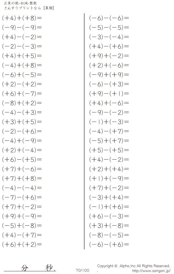 上記のボタンから「正負の数-加減-整数」の算数数学ドリル・計算ドリル(PDFプリント)がダウンロードできます。個人利用は無料です(家庭以外での配布は有料です)。