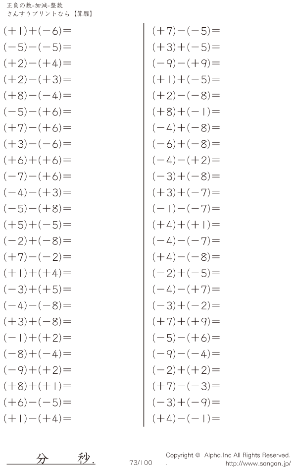上記のボタンから「正負の数-加減-整数」の算数数学ドリル・計算ドリル(PDFプリント)がダウンロードできます。個人利用は無料です(家庭以外での配布は有料です)。