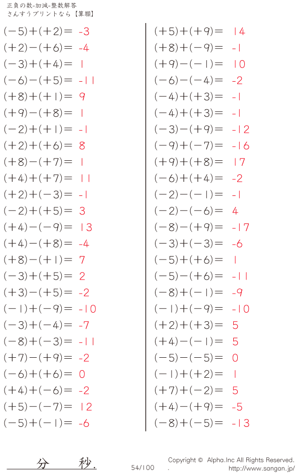 上記のボタンから「正負の数-加減-整数」の算数数学ドリル・計算ドリル(PDFプリント)がダウンロードできます。個人利用は無料です(家庭以外での配布は有料です)。