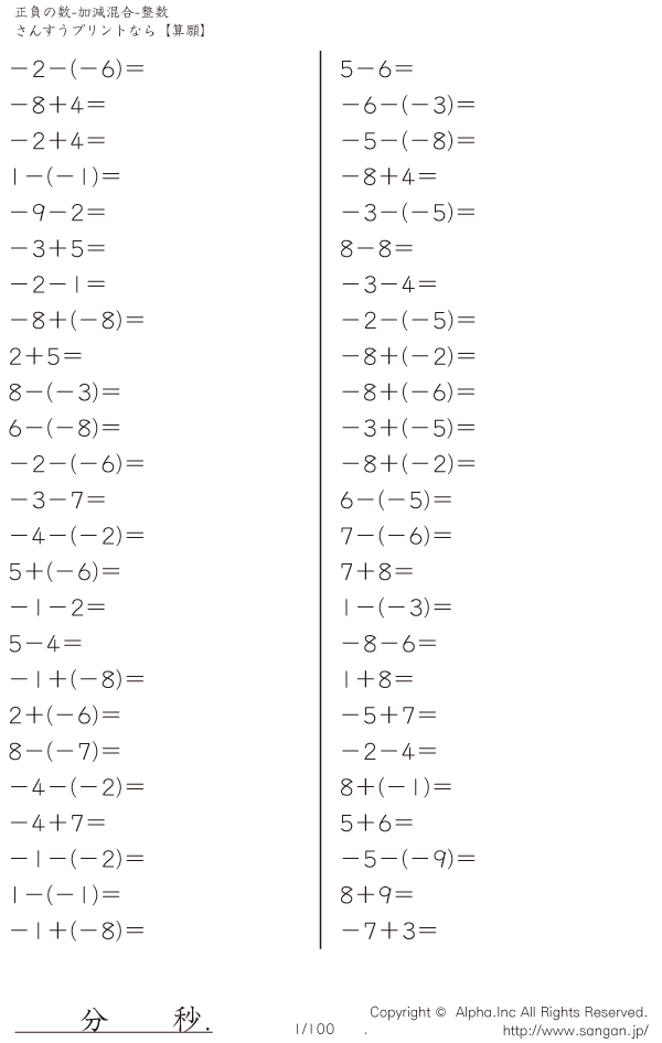 正負の数-加減混合-整数 [問題]001/100