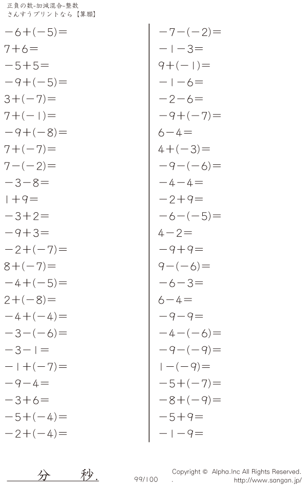 正負の数-加減混合-整数 [問題]099/100