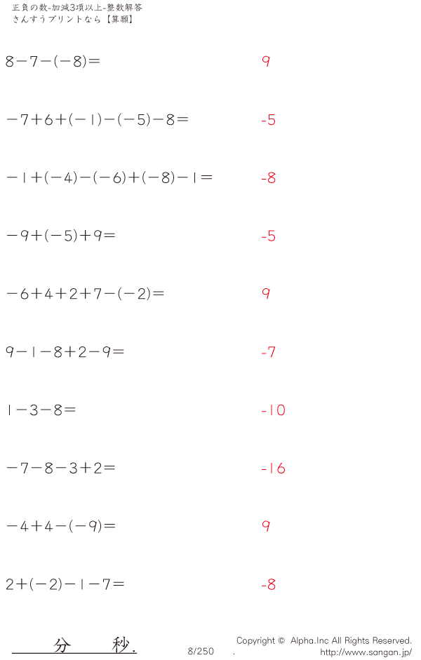 正負の数-加減混合-3項以上 [解答]008/250
