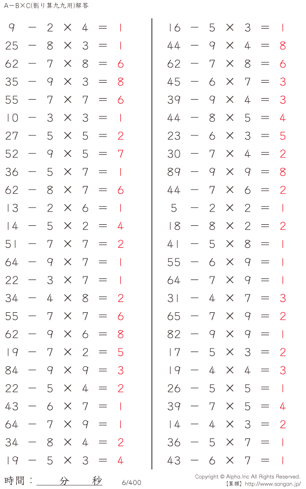 上記のボタンから「A-B×C」の算数数学ドリル・計算ドリル(PDFプリント)がダウンロードできます。個人利用は無料です(家庭以外での配布は有料です)。