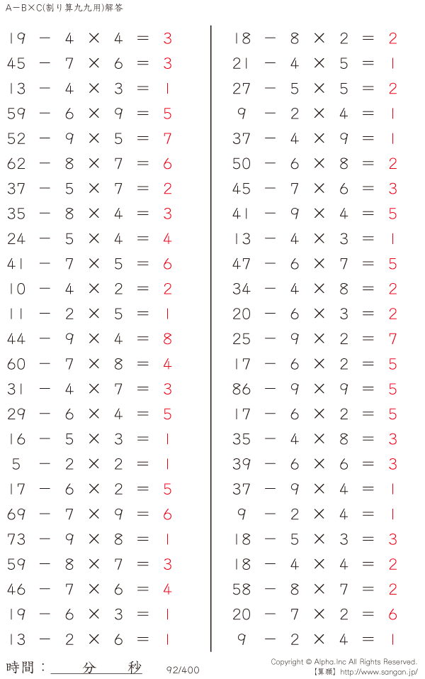上記のボタンから「A-B×C」の算数数学ドリル・計算ドリル(PDFプリント)がダウンロードできます。個人利用は無料です(家庭以外での配布は有料です)。