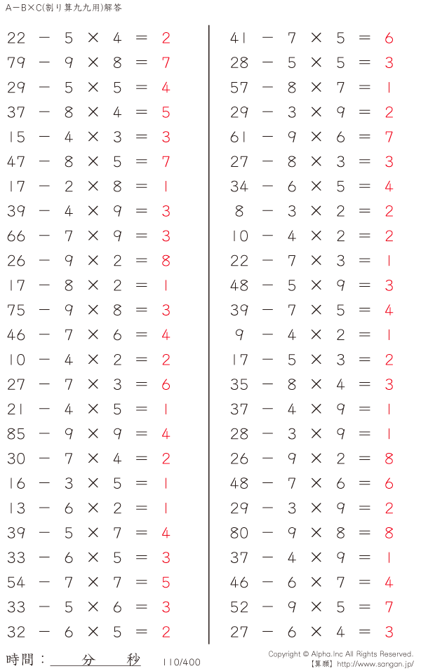 上記のボタンから「A-B×C」の算数数学ドリル・計算ドリル(PDFプリント)がダウンロードできます。個人利用は無料です(家庭以外での配布は有料です)。