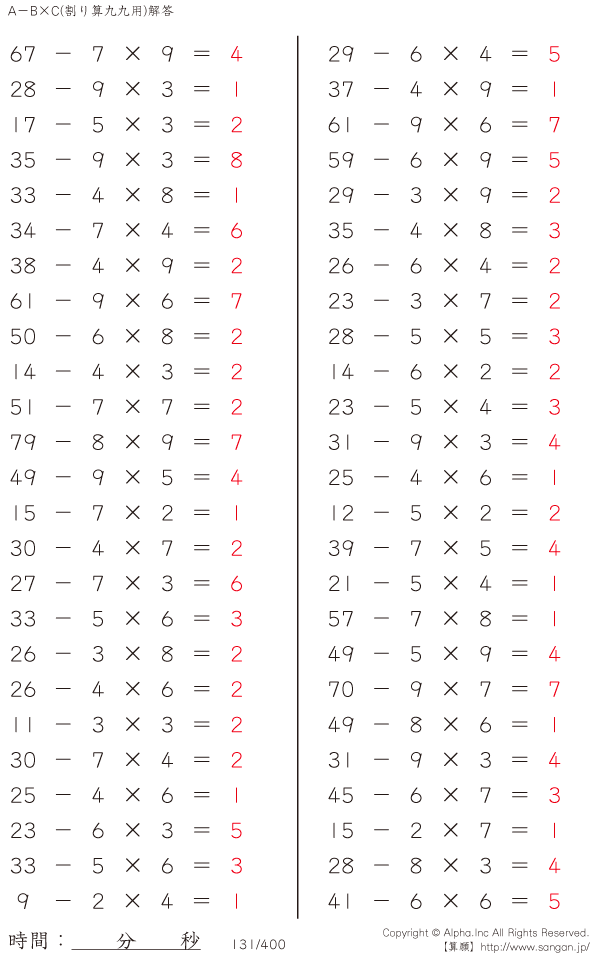 上記のボタンから「A-B×C」の算数数学ドリル・計算ドリル(PDFプリント)がダウンロードできます。個人利用は無料です(家庭以外での配布は有料です)。