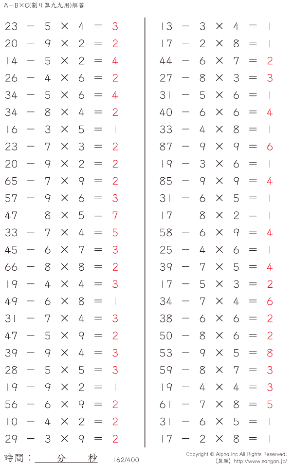 上記のボタンから「A-B×C」の算数数学ドリル・計算ドリル(PDFプリント)がダウンロードできます。個人利用は無料です(家庭以外での配布は有料です)。