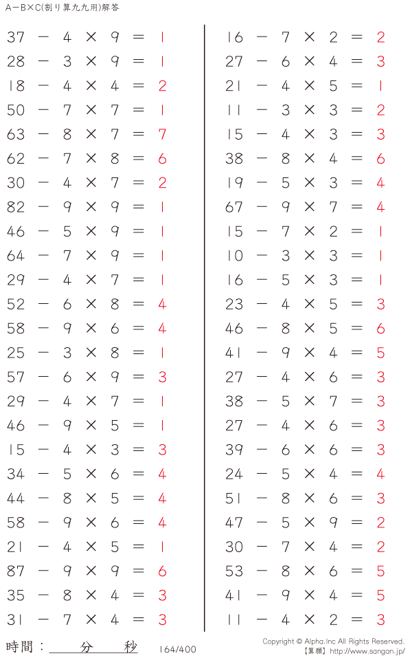 上記のボタンから「A-B×C」の算数数学ドリル・計算ドリル(PDFプリント)がダウンロードできます。個人利用は無料です(家庭以外での配布は有料です)。