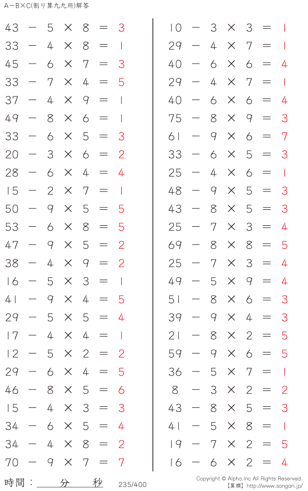 上記のボタンから「A-B×C」の算数数学ドリル・計算ドリル(PDFプリント)がダウンロードできます。個人利用は無料です(家庭以外での配布は有料です)。