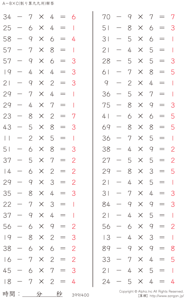 上記のボタンから「A-B×C」の算数数学ドリル・計算ドリル(PDFプリント)がダウンロードできます。個人利用は無料です(家庭以外での配布は有料です)。
