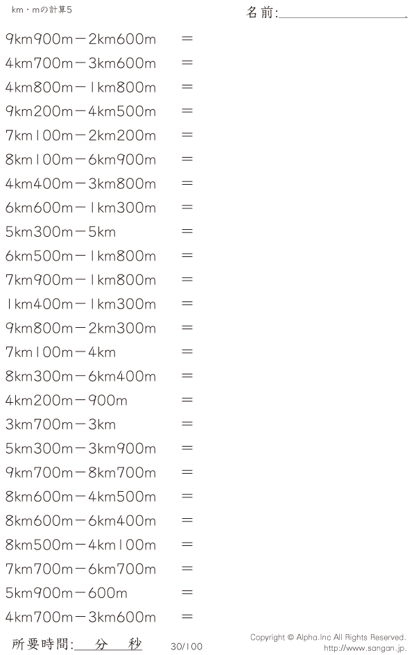 上記のボタンから「km・mの引き算」の算数数学ドリル・計算ドリル(PDFプリント)がダウンロードできます。個人利用は無料です(家庭以外での配布は有料です)。