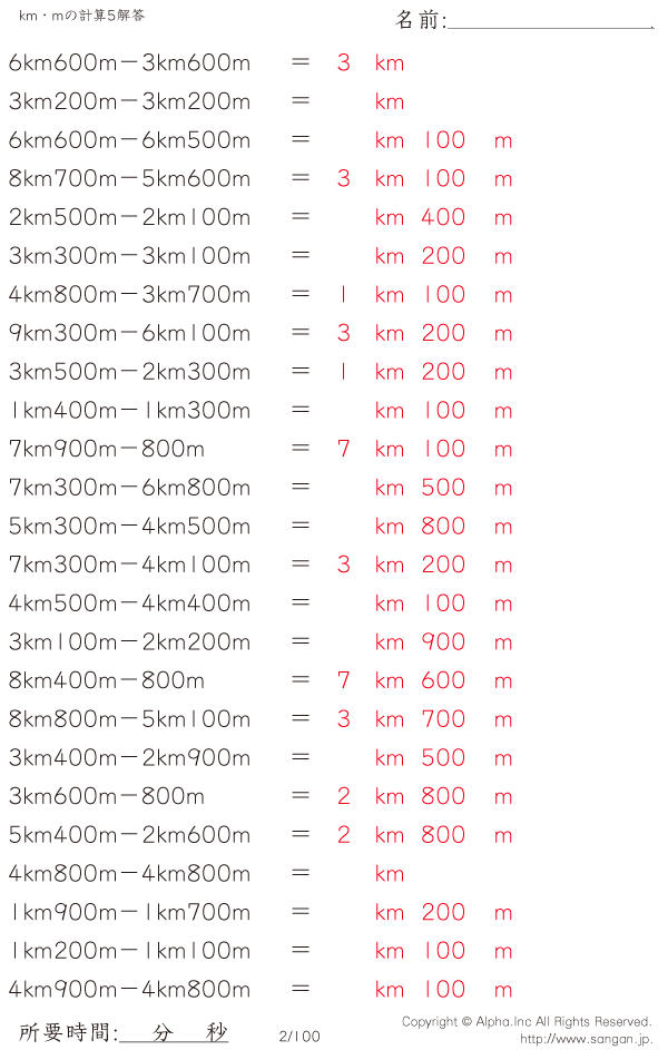 km・mの引き算 [解答]002/100