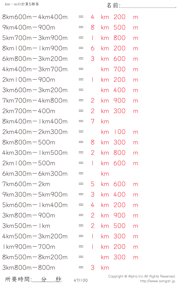 上記のボタンから「km・mの引き算」の算数数学ドリル・計算ドリル(PDFプリント)がダウンロードできます。個人利用は無料です(家庭以外での配布は有料です)。