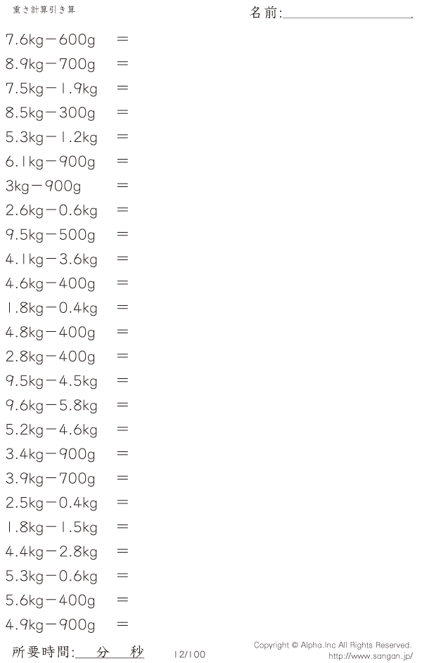 上記のボタンから「kg・gの引き算」の算数数学ドリル・計算ドリル(PDFプリント)がダウンロードできます。個人利用は無料です(家庭以外での配布は有料です)。
