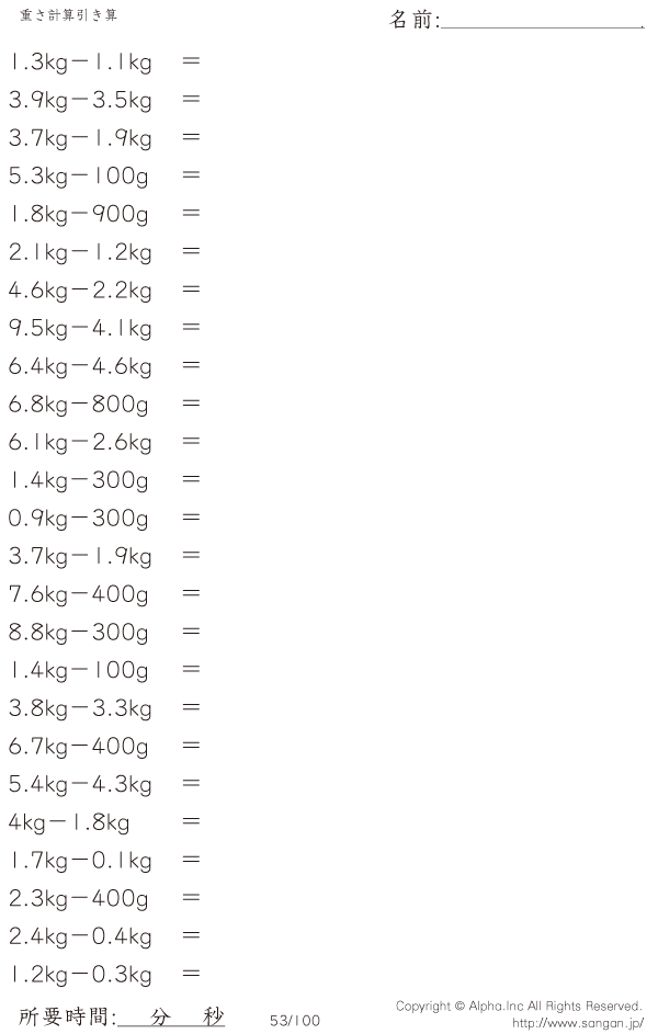 上記のボタンから「kg・gの引き算」の算数数学ドリル・計算ドリル(PDFプリント)がダウンロードできます。個人利用は無料です(家庭以外での配布は有料です)。