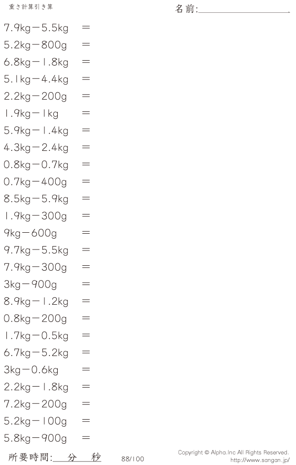 上記のボタンから「kg・gの引き算」の算数数学ドリル・計算ドリル(PDFプリント)がダウンロードできます。個人利用は無料です(家庭以外での配布は有料です)。