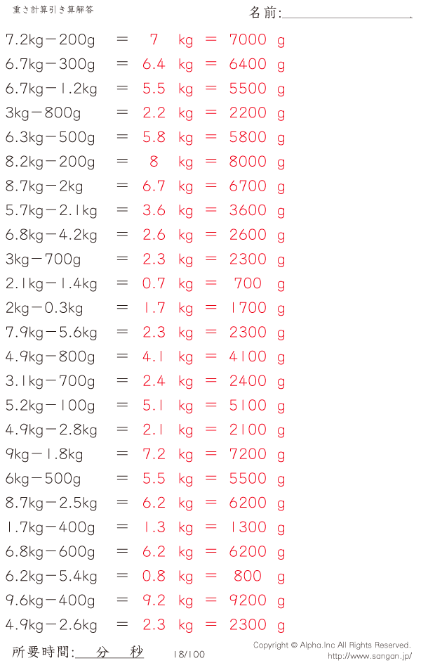 上記のボタンから「kg・gの引き算」の算数数学ドリル・計算ドリル(PDFプリント)がダウンロードできます。個人利用は無料です(家庭以外での配布は有料です)。
